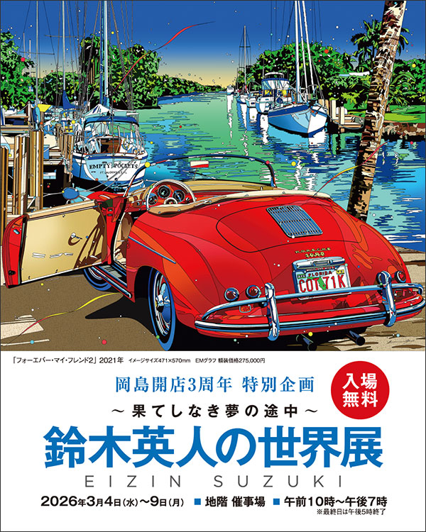 80年代より、アメリカのリゾート地やクラシックカーを題材に、イラストレーターとして第一線で活躍している鈴木英人氏。光の陰影を繊細な線でかたどり、その中を透明感ある色彩で埋めていく独特の作品スタイルは、多くのファンを魅了しています。本展では、鈴木英人の世界観を表現し、80年代の貴重なパントーン原画や、350以上の版画作品の中から厳選した、特に人気のある版画、グッズなどを展示販売いたします。ぜひ、EIZIN WORLDをご堪能ください。